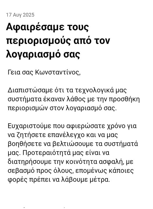 ΥΓ 1. Τα καρακόλια του Ζούκερμπεργκ μετά από δύο μήνες θυμήθηκαν να με βγάλουν ψεύτη για μια ανάρτηση στο facebook και για σωφρονισμό με έβαλαν τιμωρία τρεις μήνες σε “χαμηλή ροή”.