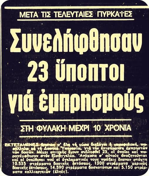 Μάλιστα το κόλπο της εξουσίας είναι διαχρονικό. Ο Κ. Βαθιώτης έγραψε ότι “οι πυρκαϊές ήταν πάντοτε αποδεκτές, αν όχι βαλτές από τις ίδιες τις κυβερνήσεις μας, οι οποίες, για το ξεκάρφωμα, έσπευδαν κατόπιν εορτής να προπαγανδίσουν τις συλλήψεις και τον κατευναστικό εισαγγελικό μπαμπούλα (https://oudensxolion.gr/?p=9443).